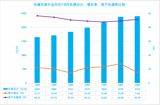 2.10 儀器儀表行業(yè)歷年1-9月負債合計、增長率、資產(chǎn)負債率比較